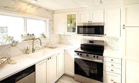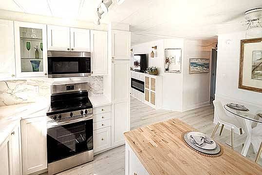 AS YOU DRIVE UP, YOU'LL NOTE THE SPACIOUS DOUBLE DRIVEWAY AND PROFESSIONALLY LANDSCAPED GROUNDS, ALL NEW WINDOWS AND SLIDERS. NAMED FOR ITS EVER-PRESENT BLUE WATER AND BLUE SKIES, THIS PROFESSIONALLY REIMAGINED, AND FULLY FURNISHED 2/2 HOME FEATURES QUARTZ COUNTERTOPS AND SINK, NEW CABINETS AND APPLIANCES INCLUDING MICROWAVE, RANGE,DISHWASHER, AND REFRIGERATOR PLUS NEW SOFT-CLOSE CABINETS WITH PLENTY OF STORAGE! THE LIGHT-AND-BRIGHT OPEN FLOOR PLAN ENCOURAGES INTIMATE GATHERINGS AND LARGE PARTIES. A MINI-SPLIT HEATING AND COOLING SYSTEM ALLOWS VARYING TEMPERATURES BY ZONE. BOTH BATHROOMS HAVE BEEN THOUGHTFULLY REMODELED WITH PLENTY OF STORAGE. THE FOLD OUT SOFA BED IN THE GUEST ROOM ALLOWS IT TO FUNCTION AS AN OFFICE WHEN A BEDROOM IS NOT NEEDED. THERE ARE PLENTY OF CLOSETS THROUGHOUT WITH BUILT-IN SHELVES FOR EASY HOME ORGANIZATION. FRONT AND REAR RING CAMERAS PROVIDE SECURITY AND REMOTE MONITORING VIA PHONE APP FOR WHEN YOU ARE AWAY FROM HOME. A TIDY STORAGE CABINET SITS JUST OFF THE REAR OF THE HOME. THE COVERED AND PAVED DRIVEWAY IS BIG ENOUGH TO PARK TWO CARS SIDE BY SIDE. ENJOY SUNRISES OVER THE CANAL FROM A SPACIOUS FLORIDA ROOM WRAPPED BY WINDOWS OR FROM THE COZY EXTERIOR DECK-BOTH PROVIDING A PERFECT PERCH FOR WATCHING MANATEES,DOLPHINS, TURTLES,DUCKS, EGRETS, AND HAWKS. ENJOY BEING ON THE WATER? LAUNCH YOUR KAYAK DIRECTLY FROM THE BACKYARD. NESTING MERE MINUTES FROM NEW PORT RICHEY'S HISTORIC DOWNTOWN, THIS DOUBLE WIDE IS A PART OF A 55-AND-UP MANUFACTURED HOME COMMUNITY WITH A SWIMMING POOL AND WEEKLY CLUBHOUSE ACTIVITIES SUCH AS TRIVIA AND KARAOKE. BLUE HEAVEN SITS ON THE NATURE COAST, NEAR BOTH THE 83-ACRE STARKEY PARK AND 13.1 MILE PAVED AND SEPARATE BIKE TRAIL. WHEN YOU CRAVE PRO SPORTS OR COSMOPOLITAN CULTURE AND DINING, YOU CAN DRIVE 45 MINUTES TO BUSTLING TAMPA OR FLY FROM THE TOP RANKED TAMPA INTERNATIONAL AIRPORT. PREFER TO CHILL? SOME OF THE WORLD'S BEST BEACHES AWAIT YOU LESS THAN AN HOUR'S DRIVE AWAY. IDEAL AS A SNOWBIRD'S HOME TO ESCAPE THE BRUTAL NORTHERN WINTERS OR AS A FULL TIME FLORIDA RESIDENCE. EITHER WAY IT'S A PLACE WHERE NEIGHBORS WAVE HELLO MULTIPLE TIMES DAILY AS THEY RIDE PAST YOU ON GOLF CARTS OR WALK THE NEIGHBORHOOD. MOVE IN READY THIS SLICE OF PARADISE IS MORE THAN A HOME. IT'S A LIFESTYLE....WAITING JUST FOR YOU!! CALL VICKIE FOR YOUR OWN PRIVATE SHOWING!