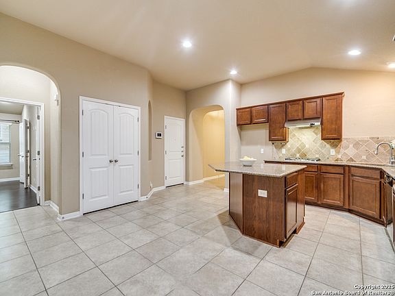 Welcome to this beautifully maintained single-story Ryland home offering 2,174 sq. ft. with 4 bedrooms and 2 full baths. This thoughtfully designed floor plan features high ceilings, durable wood-look laminate flooring throughout (no carpet), and an open concept ideal for modern living. A formal dining room greets you upon entry with the flexibility to function as a home office or multipurpose room if desired. The gourmet island kitchen includes granite countertops, tile backsplash, 36-inch cabinets, and stainless steel built-in appliances including an oven, a gas cooktop, microwave, and dishwasher. An abundance of upper and lower cabinets ensures plenty of storage and functionality. The spacious living room creates a comfortable environment for entertaining and daily life. The flexible bonus room provides additional options-perfect for a home office, media room, or play space. The private primary suite includes a large walk-in closet, dual vanities, and a walk-in shower with built-in seating. Additional highlights include a water softener loop, window blinds throughout, and a two-car garage. The four-sides brick exterior ensures low maintenance. Enjoy outdoor living with a covered patio and extended concrete pad, ideal for BBQs and gatherings, complemented by a freshly sodded backyard ready for relaxation. The inviting neighborhood amenities include gated access, a pool, clubhouse, tennis court, and basketball court. Conveniently located near shopping, dining, and Government Canyon State Park, quick access to Loop 1604, Highway 151, and Lackland AFB.