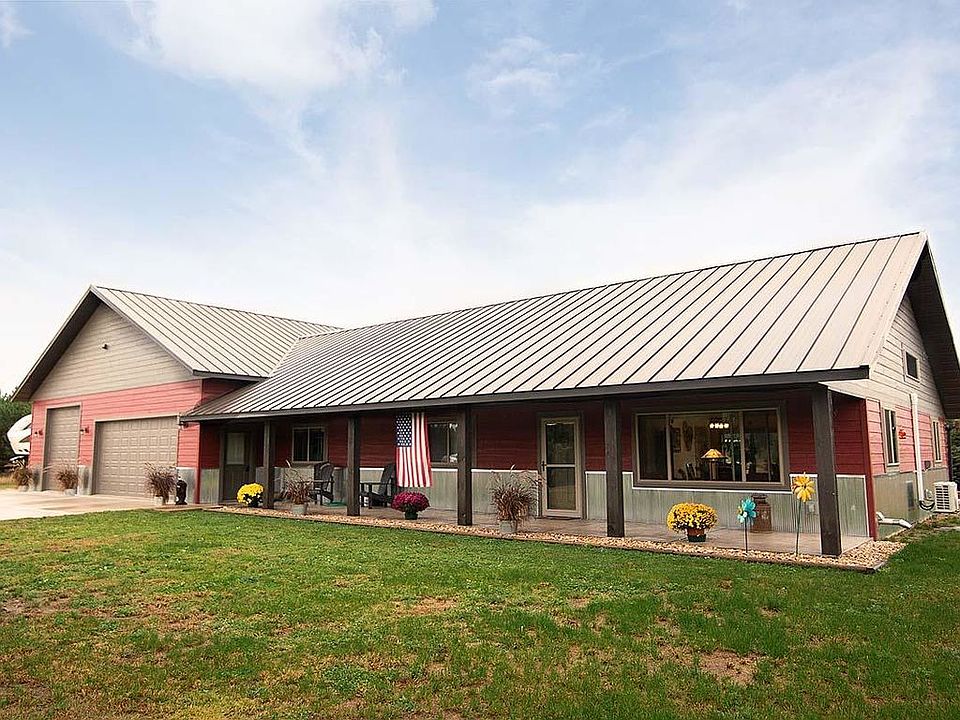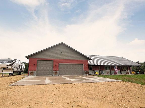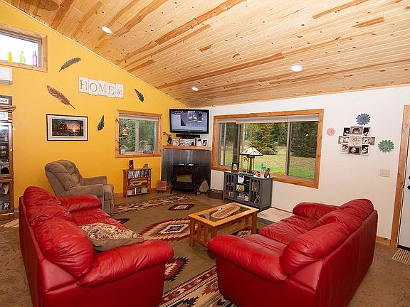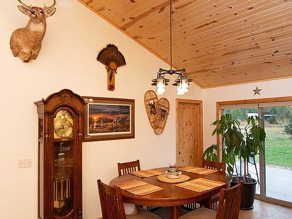 Two year old home on twelve private, wooded acres. Home features three bedrooms, two baths and huge garage. No steps in the home. Heated, stamped, stained concrete floors throughout are durable and add warmth and character to the home. Open concept. Knotty alder cabinets and doors. Pellet stove in the family room. Low maintenance exterior fiber board siding and steel roof. Additional parking pad with RV hook up for electric, water and sewer. Property bordered by more than 1000 acres of public land. ATV and snowmobile trails pass right by the property.
