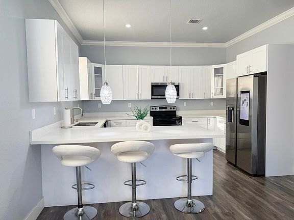 Discover this stunning 3-bedroom, 2-bath home perfectly blending comfort, style, and functionality! Featuring soaring 10-ft ceilings with crown molding, elegant vinyl and tile flooring, and spacious living and family rooms. The modern kitchen shines with quartz countertops, stainless steel appliances, and a smart refrigerator. The primary suite offers a walk-in closet, dual sinks, and sliding impact glass doors leading to a covered patioa"perfect for relaxing. Enjoy peace of mind with impact windows and doors, security cameras, and a two-car garage with remote and keypad entry. Complete with front and rear porches and an automatic sprinkler systema"this home is truly move-in ready!