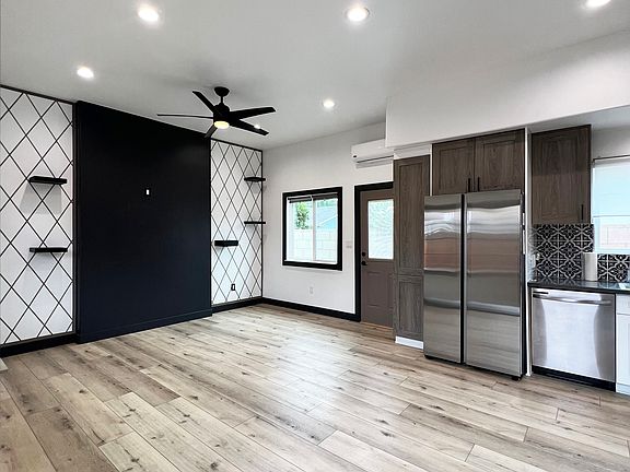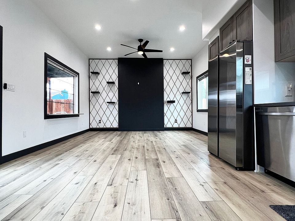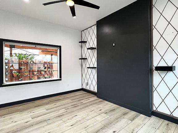 Private fenced yardLive plantsDecorative wood accentsModern cabinetryLarge windowsNatural lightLaminated floors