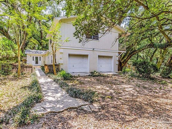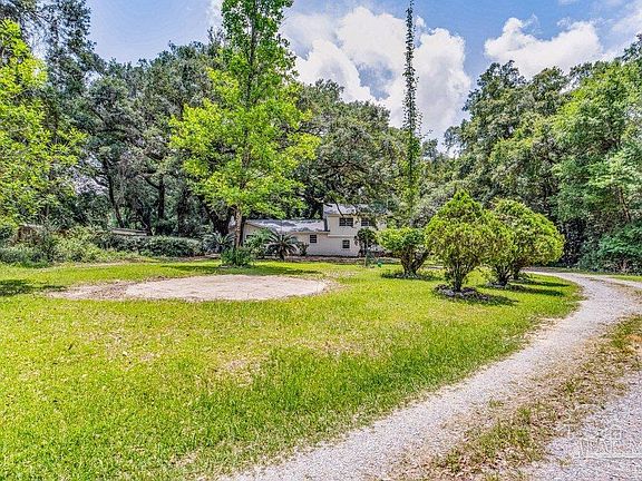 A HIDDEN GEM OVER 5 ACRES right off Blue Angel Parkway!!! This 4 bedroom, 2 bath home is waiting for your final touches to make it your own!! There is a large living area with a wood burning fireplace, eat in kitchen with tile flooring, 3 bedrooms and one bath are on the first level. You also have a LARGE outside deck that is great for entertaining!! Upstairs you will find the large master bedroom and bathroom with a beautiful private balcony. This property also has a 3 bay metal shed with power and another smaller wooden shed. There is a chicken coop in the back and endless possibilities with over 5 acres of land and mature trees that you can call your own!! Seller has survey with seal!! Newer 2022 roof!!