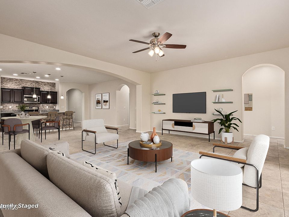 ENJOY LOWER UTILITY BILLS WITH FULLY PAID SOLAR LEASE! Discover this beautifully upgraded 2015 home in Anthem at Merrill Ranch with an oversized 2.5 car tandem garage - room for a golf cart, two full-sized sport utility vehicles plus storage! The 1,993 sq.ft. ''Manzanita'' floor plan offers a split floor plan with 3 bedrooms plus a versatile den, 2 full bathrooms, and an inviting great room filled with natural light. The open-concept kitchen is a true centerpiece, featuring stunning granite countertops, custom tile accents, stainless steel appliances, and a generous island with breakfast bar seating and pendant lights. The primary suite provides a peaceful retreat with dual vanities, large walk-in shower with overhead rainfall showerhead plus dual wall showerheads, and walk-in closet. Step outside to a serene, low-maintenance turf backyard with an extended covered patio, perfect for relaxing or entertaining. With access to the Parkside Community Center and park, offering endless amenities for all ages, this home delivers comfort, style, and an unmatched lifestyle!
