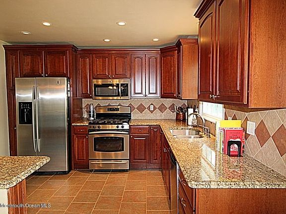 Beautiful Bi-level on oversized lot, 3 bedrooms, 2 baths. Gorgeous brand new tiled master bath! Updated kitchen with granite counters, cherry cabinets, stainless steel appliances and new microwave. Open floor plan, large living room and dining room with hardwood floors. Dining room leads to upper deck overlooking backyard. French Doors in family room downstairs open to backyard complete with in-ground pool and newly fenced-in yard. Wood burning fireplace in family room. New Aluminum pool fencing (2019), New paver patio (2019), New roof (2014), new AC & programmable thermostat (2013), Hunter Douglas blinds/shades included, upgraded closets, quite/friendly neighborhood, excellent school system, bus stops in front of house. Downstairs is perfect for in-law or adult-child suite w/private entrance. Walk to town, minutes to beach but located in a quiet residential area.