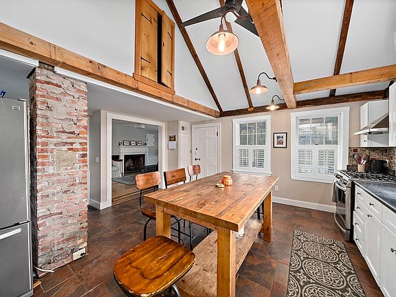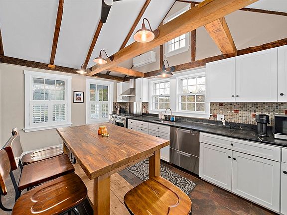 Tucked behind stone walls on a storybook 1.5 acre lot stands the Timothy Rogers House, a lovingly cared for Gambrel/Dutch Colonial where history and modern comfort meet. Step onto the freshly painted, detailed front porch and feel the welcome of time well kept. Inside, wide pine floors and rustic beams frame rooms warmed by four fireplaces. The open kitchen, crowned by a cathedral ceiling, shines with soapstone counters and stainless appliances. Love the heated sunroom that overlooks the lush perennial gardens, cabana, potting shed, and sparkling Gunite pool with new pool decking added in 2022. Updates in 2024 include a new roof, generator, exterior paint, window treatments/shutters, furnace, water heater, stove, dishwasher, sprinkler system, HVAC units, and natural gas line pulled to the home. A serene first-floor primary suite, cozy living & dining rooms, and a book-lined office complete the main level, while upstairs, there are two charming bedrooms and a beautifully updated bath.