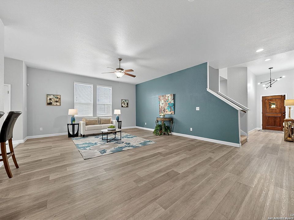 OPEN HOUSE SAT, 11/22, 12-3PM. Beautiful 1.5-story greenbelt home tucked away on a quiet cul-de-sac in the gated community of Wortham Oaks. This open and inviting 2,661 SF floorplan features 3 bedrooms all on the first floor, 2 baths, a private study/office, and an upstairs gameroom ideal for additional living or entertainment space. With no carpet on the first level, the home is wonderfully allergy friendly. A charming wine room is cleverly nestled under the stairs, and the fabulous island kitchen offers a breakfast bar, gas cooking, granite countertops, and freshly installed tile. Thoughtful upgrades and money-saving features include an expanded Trex deck with storage below, full sprinkler system, 2-year-old 14.3 SEER, 4-ton HVAC, 2-year-old roof with transferable warranty, water softener, and 2-year-old front and rear gutters. Enjoy Texas barbecues and game days on the covered patio with included mounted TV, all while overlooking the serene greenbelt. Nestled within a sought-after community featuring on-site elementary and middle schools, and located just minutes from shopping, dining, and entertainment. This is the one-make it yours today!