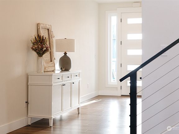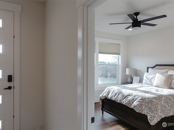 This stunning NW contemporary home has it all! Extra wide entry hall, soaring ceilings, and large windows. Perfect open layout, kitchen with quartz counters, huge waterfall island, pot filler, and an immense Frigidaire Professional series fridge/freezer. Gorgeous stone fireplace, top quality tile work throughout. Ensuite master with soaking tub and second master on main. Accent lighting under cabinets and vanities. Tankless water heater, heat pump for A/C in the summers. Unobstructed Mt Baker and Twin Sister views from the 2nd story deck. Fully fenced yard and covered patio for outdoor entertainment backs up to acreage. 65” Samsung Frame TV and Sonos sound bar included. Luxury living, no HOA, dead end street. A truly amazing opportunity!
