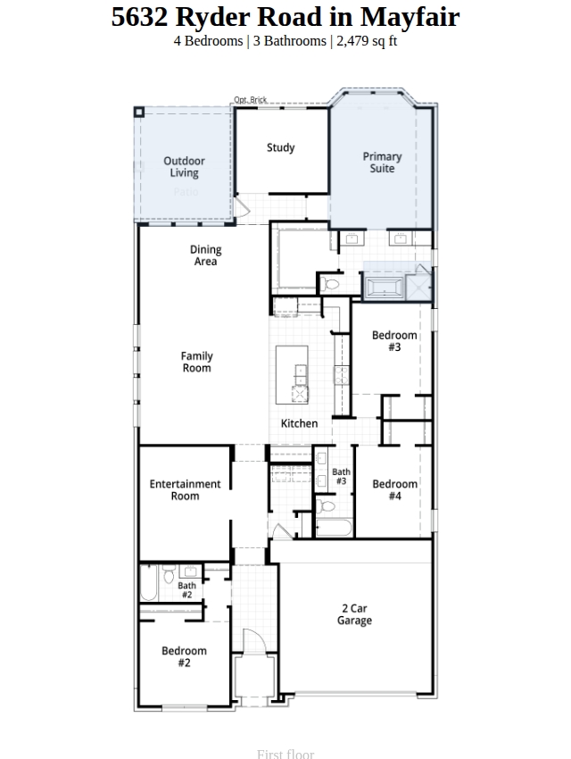 Beautifully designed one-story home with four bedrooms and four bathrooms. The open living area is very spacious and ready for entertaining or just feeling cozy and content. This home offers a study and an entertainment room which can be used in multiple ways. There is a luxury primary suite extension, which gives ample room for sitting and drinking coffee or tea or just a little reading. A freestanding tub in the primary bathroom with double vanities, and there is more....extended outdoor living and stone accent in the front. You will love this plan!