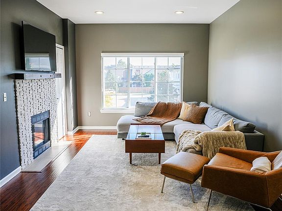 Quartz countertopsDetailed stack-tiled fireplaceOpen-concept layoutPrivate balconyStainless steel appliancesHard-surface flooring