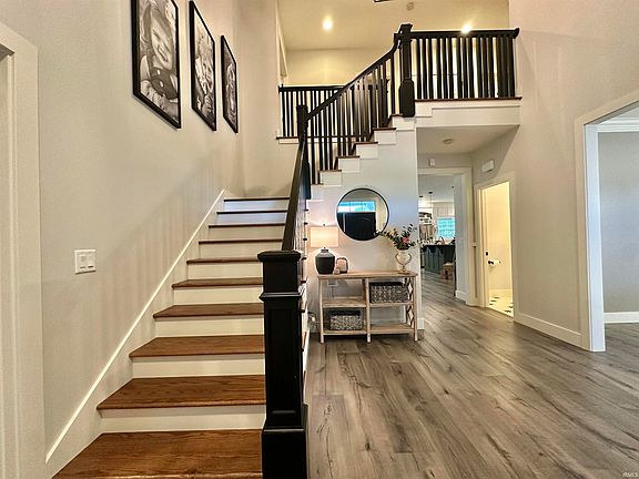This stunning and elegant home sits gracefully on a hill at the end of a cul-de-sac in Autumn Ridge Estates, conveniently located off Sharon Road in Newburgh, Indiana. Built by Chad Van Zilen in 2011, this Energy Star Rated gem now boasts a remodeled and updated kitchen, all new flooring on the main level, and a super efficient HVAC system. The curb appeal is breathtaking, with landscaping that enhances the home's natural beauty. The inviting front facade is complemented by a side-load two-car garage that blends seamlessly with the home's design. As you step into the foyer, you'll find a sophisticated home office to your left, featuring an open yet private layout with tall shelves accessible via a sliding library ladder. To the right of the foyer, a formal dining room awaits. Moving forward, you'll enter the very spacious sunken Great Room (19 x 18) and the Kitchen (23 x 20), both flooded with natural light and boasting a gorgeous aesthetic. The kitchen is a dream come true, with beautiful white cabinetry, a large island/bar, stunning granite countertops, and an eye-catching backsplash. All four bedrooms and three full bathrooms are located upstairs, offering ample space and comfort. The master bedroom includes a cozy sitting area (8 x 11), a luxurious master bath, and access to a balcony above the porch. Additionally, there's a bonus room upstairs, providing even more flexible living space.