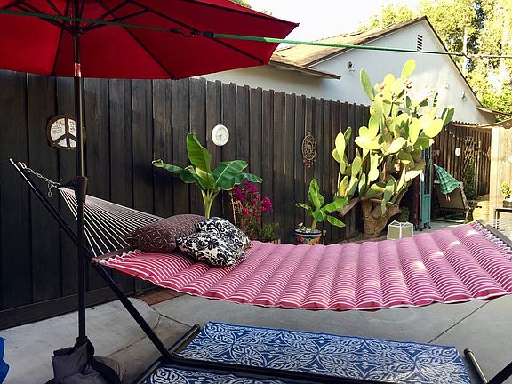 This home has many wonderful upgrades and zen touches to bring you rest and relaxation in the expansive outdoor areas. As you walk up the stone paved walkway, you are welcomed by a majestic pine tree, and a variety of succulents, roses, gardenias, and fruit trees such as apple, pomegranate, orange and papaya, among others. Walking into the backyard, you will find many tranquil spaces in which to meditate, or to entertain friends and family. Let the hot tub jets melt away the stress of your workday in your own private oasis that includes an 8 ft. tall fence and outdoor heated shower. The converted garage has been used as a home office, but can easily be converted back per the buyer's preference.
