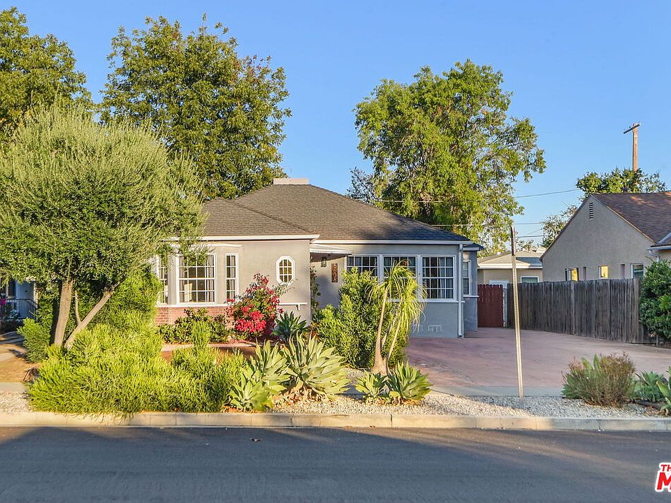 Located on a beautiful tree-lined street adjacent to NoHo Arts District, this 1940s ranch offers all the character you want with the functionality you actually need. Inside, natural light flows across hardwood and tile floors. The living room and den both feature classic beamed ceilings, while the den's skylight floods the space with sun. The dining room's pitched wood ceiling adds architectural warmth. The kitchen delivers ample cabinet storage, generous counter space, and a classic work triangle layout that keeps the host connected with dinner guests. The home offers three bedrooms: two traditional bedrooms plus a third space with French doors, currently used as an office, that functions perfectly well as a home office or third bedroom (w/o built-in closet). Beautiful natural light flows throughout. The primary bedroom opens onto a private patio surrounded by succulents, a serene spot for morning coffee or evening relaxation. The practical updates are all in place: updated roof, copper plumbing, upgraded electrical, central A/C, and indoor laundry area. A perfect floor plan connects seamlessly to the backyard. The gated driveway and generous yard complete with two potted fruit trees, Meyer lemon and apricot provide plenty of room for outdoor living, gardening, or future pool potential. A converted garage offers a fully finished, climate-controlled sound studio, plus an adjacent unfinished room ready to become a recording suite or control room. Perfect for musicians, content creators, or anyone working from home. Just minutes from NoHo's theaters, Metro station, and vibrant dining scene, this is a rare find in one of LA's most creative neighborhoods.