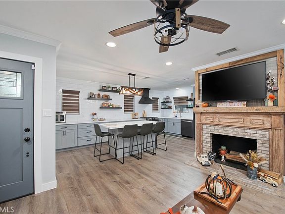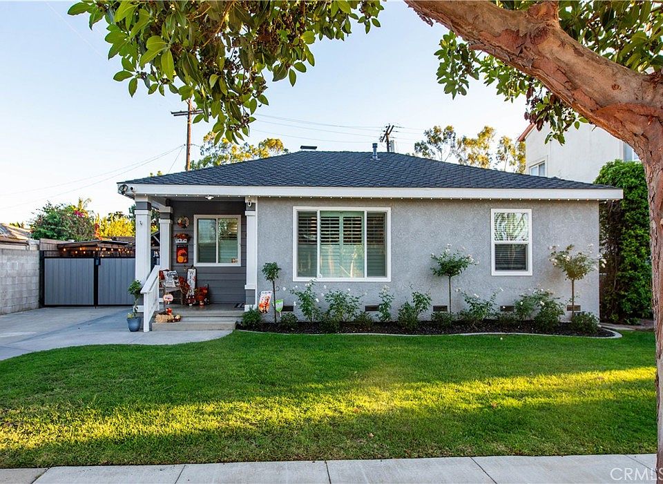 Welcome to this beautifully renovated single-story home located in Long Beach’s highly desirable South of Conant neighborhood. Offering a total of 1,644 sq.ft. of living space, this property includes a thoughtfully upgraded main home, a versatile enclosed patio, and a garage converted into a fully functional studio.The main home offers 969 sq.ft. with 2 bedrooms and 2 bathrooms. From the moment you arrive, you’ll be charmed by the home’s inviting curb appeal, complete with a front porch, fresh exterior paint, newer windows and fascia board and beautifully landscaped front and back yards. A brand-new roof installed in 2025, updated gutters and downspouts, and a steel-framed driveway gate add to the home’s durability and peace of mind. For year-round ambiance, the decorative lighting system, operated via wifi, illuminates both the front and back of the home. Inside, a warm and inviting interior highlighted by newer luxury vinyl flooring throughout, crown molding, high baseboards, recessed lighting, and plantation shutters. A cozy fireplace with a barnwood beam mantle anchors the living area. The custom kitchen is a true showstopper with a large center island, quartz countertops, subway tile backsplash, stainless steel appliances, modern cabinetry with pots-and-pan drawers, and a pantry with a built-in coffee station. The hallway bathroom is thoughtfully updated with a modern farmhouse-industrial style, decorative tile accents, and a sleek vanity, while one bedroom enjoys a private en-suite bath. Energy-efficient features include solar panels, newer tankless water heater, newer insulation, and a cool roof attic fan. Central heating and air conditioning ensure year-round comfort. The 315 sq.ft. enclosed patio expands the living space with accordion glass walls, shiplap accents, a modern fireplace heater, ceiling fans, and its own AC/heat split system—perfect for year-round enjoyment. The garage has been converted into a 360 sq.ft. studio complete with a bathroom, kitchenette with custom cabinetry, its own AC/heat split system, and dedicated laundry—ideal for guests, a private workspace, or rental potential. Step outside to your private backyard retreat with two pergolas, a covered patio, and a sparkling pebble tec pool and spa. Set on a tree-lined street close to shopping, dining, schools, and Long Beach Airport—with the beach and 405 freeway just minutes away—this home combines modern amenities, energy efficiency, and flexible living spaces.