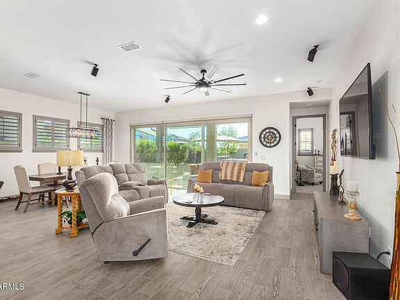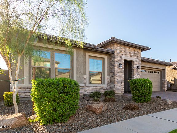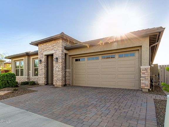 STUNNING Southwest Contemporary home on a premium corner lot in the popular Community of Cadence! Great curb appeal w/ stone accents, low-care landscape, & a 3-car tandem garage w/paver driveway. Inviting hallway ushers you to the sophisticated open floor plan, boasting plantation shutters, gorgeous wood-plank tile floors, a pre-wired surround sound, & multi-sliders to the back patio. The Gourmet Kitchen is fully equipped w/a wall oven, microwave, a gas cooktop, quartz counters, staggered wood cabinetry w/crown moulding, tile backsplash, a pantry, recessed & pendant lighting, & a large island w/a breakfast bar. Grand main suite has plush carpeting underfoot, a sitting area, an exclusive bathroom w/dual sinks & a step-in shower, & a sizable walk-in closet. There are 3 additional bedrooms, all ample size and there's also a separate Den/Office. Inside laundry room with storage and a large counter area. Washer and Dryer convey with the sale. The wonderful backyard is an entertainer's paradise, offering a covered patio w/a fire pit & an outdoor kitchen w/built-in BBQ & a wine cooler. Two large shade umbrellas will convey with the sale. Cadence is a beautiful master planned community that centers around The Square, an 8-acre community park featuring a 12,000 sqft clubhouse, pools that are more like water parks, a gym, tennis courts, basketball, volleyball, parks, walking trails, and playgrounds for the kids. Enjoy the myriad of events planned throughout the year to entertain your family!