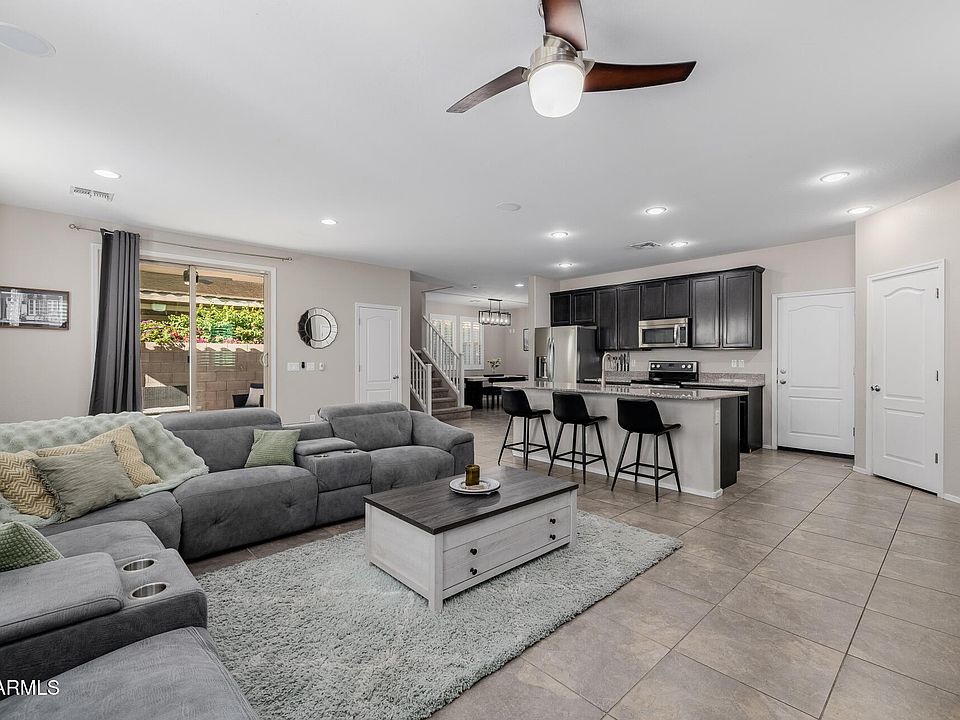 Extended travertine-covered patioRecessed lightsVersatile loft upstairsLow-care landscapeTall ceilingsNeutral paintTons of natural light