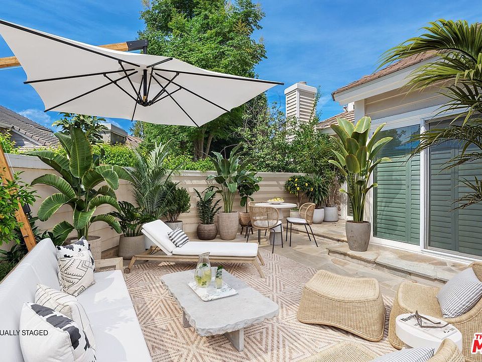 Large Price improvement!! Discover one of the most desirable homes in Meadow Oaks, the gated North Ranch community where opportunities rarely come on the market. Perfectly positioned at the end of a private cul-de-sac with no homes directly across the street, this 3-bedroom, 3-bath residence spans over 2,145 sq. ft. and delivers the ideal mix of privacy, light, and modern comfort. A grand oak tree frames the entry, opening into a bright, airy living room flooded with natural light. Plantation shutters frame the space beautifully and add a sense of quiet drama, while a versatile den just off the kitchen works perfectly as an entertainment lounge, media area, or creative retreat. The chef-inspired kitchen is the heart of the home, featuring a large breakfast bar with seating, soft-close cabinetry, and a suite of premium appliances, Viking, Sub-Zero, Bosch, and KitchenAid. It's a space designed for cooking, conversation, and connection. Upstairs, the primary suite feels like a private sanctuary calming, light-filled, and set apart from the rest of the home. Extra-tall ceilings create an open, elevated feel, and the private balcony offers the perfect place to enjoy morning coffee overlooking the oak tree and surrounding greenery. Two additional bedrooms, each with hardwood floors, provide flexibility for family, guests, or a home office. Outdoor living continues with a private fenced patio, ideal for dining under the stars or relaxed weekend gatherings. The two-car attached garage provides direct entry, an epoxy-finished floor, and custom storage, keeping everything organized and easy to access. Pet friendly community. Located within a short distance of local shopping, coffee spots, favorite neighborhood walking trails and dog parks. Come see for yourself why this residence stands out. Some photos have been virtually staged.