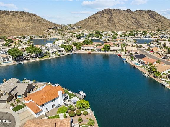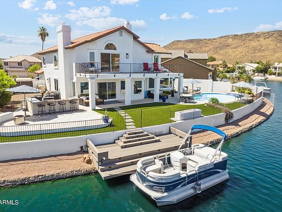 Gorgeous, redesigned home located on the best lot in Arrowhead Lakes! Walk in the custom front door to spectacular unobstructed long water and sunrise mountain views. Entertainers' kitchen includes custom cabinets, boasts Monogram induction cooktop, wall oven, 3-way microwave and Bosch refrigerator and dish washer. Fourty eight inch Chefs sink + prep sink in huge island, granite counter tops, custom back splash, and those views! Comfortable family room with linear gas fireplace and sliders to the dream come true back yard. Step onto the travertine patio to experience resort like outdoor living with 12 ft barbeque including gas grill, sink, ice chest and refrigerator. Enjoy the custom gas fire feature, refreshing Shasta Glass pool and 20'illuminated Trex dock for your boat. Contemporary iron railings lead to 2nd floor. Double doors welcome you to your sanctuary of a primary suite complete with wood burning fireplace. Custom millwork wardrobe with dolomite topped island and coffee bar with beverage refrigerator. Primary bath with dual marble vanities, free standing jetted tub, dressing area, water closet and incredible glass tiled shower. Sliding glass doors lead to your private upper balcony.