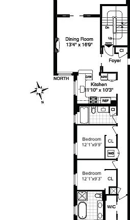 Fourth (top) floor apartment, please note there is built in closet space in the smaller bedrooms not shown on floor-plan, a basement storage room that comes with apartment, and stroller storage in foyer under stairs.