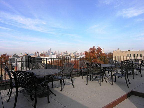 Each of the 2 full baths feature dual flush, water saving TOTO toilets, teak cabinets, modern freestanding soaking tub in master bath, brushed nickel Kohler faucets and marble tile and vanity tops. In addition, there is a shared roof deck with incredible views of the Manhattan skyline, and basement storage. Incredible details include restoration of entry foyer to include the mirror and carved wood built-in bench, original plaster, and exposed brick wall. Pets on approval.