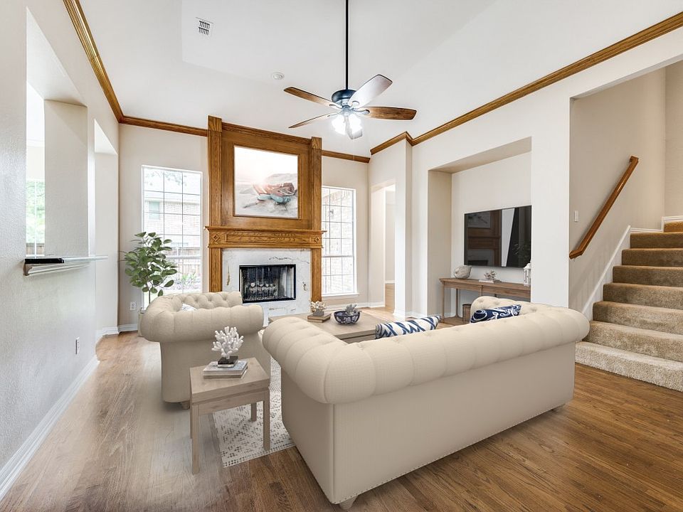 One and a half story, 4 bedroom 3 bath home located at the end of a cul-de-sac in a quiet neighborhood. The interior has been freshly painted. As you enter the home you will find a private home office to the right, and stacked formals to your left. The kitchen features include granite countertops, an island, a breakfast bar for additional seating or a serving space for entertaining. Additionally the kitchen is plumbed for gas and some of the cabinets have pull out shelves and a nice size breakfast area. family room features a gas fireplace and niche for large flat screen TV. This house has carpet only on the stairs. The remainder of the downstairs has real hardwood floors everywhere except the kitchen, bathrooms and laundry room. The primary bedroom is very spacious with room for a king size bed and a sitting area. The primary bath features a spa tub, separate shower with new glass surround, custom linen cabinet, walk in closet, and a marble look ceramic tile. The primary bathroom vanity, along with all the other bathroom vanities, has been freshened with new paint and marble countertops with undermount sinks. As you make your way upstairs, there is a small space perfect for a reading nook or desk. Let your imagination go. The 4th bedroom is located on the second floor. Its large size and ensuite allow for it to be a wonderful guest suite, a game room, or even a private office. The floors are laminate, and there is a custom built in. This ensuite bathroom features a free standing shower, custom linen cabinet, and new marble countertop with undermount sink. The yard is inviting with its mature trees and corner lot. The property sides the neighborhood common area. The backyard features newly laid sod, a patio, shade trees, a rock planter for your favorite plants, and plenty of yard left over for whatever you would want to add. The front porch is covered and inviting.