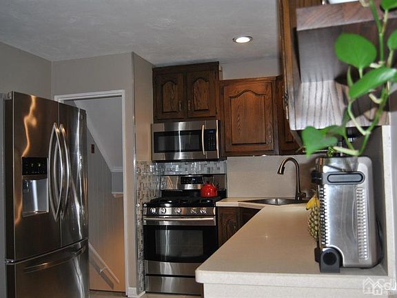 Woodbridge Township/Woodbridge Public Schools! This lovingly updated and upgraded home is only a 1/2 mile to the train station and 1 mile to Main Street. Beautiful solid oak hardwoods welcome you to the formal dining (or living room). The kitchen features stainless steel appliances, gas cooking and lovely views of the back yard and dedicated open green space beyond. Down a short flight of stairs you'll find the incredible great room with cathedral ceiling, skylights, gas fireplace and sliding doors to the private backyard that boasts a bluestone patio, new 15 X 8 shed and fully fenced yard. Also on this level is a fully renovated full bath and access to the garage. Upstairs you'll find 3 good sized bedrooms and renovated full hall bath. Home has newer vinyl siding, garage door, Wave air filtration system, water softener, new sewer and water lines to street. Close proximity to major arteries and shopping.