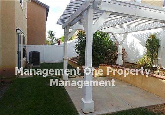 If you love to cook, you're going to LOVE this kitchen! An abundance of cabinets line the walls in the kitchen along with a large island. Stunning hardwood floors adorn the main living spaces! PLEASE NOTE -This property is managed by Management One only. Call us FIRST. Enter onto the beautiful cherry hardwood floors throughout downstairs which helps make clean up a breeze. Formal living and dining areas as well. Large upstairs loft perfect for game and/or tv room or office. The master suite features dual vanity areas, a large Roman-style soak tub, a separate shower stall, and a walk-in closet. Cozy backyard with covered patio area, ready for your BBQ and favorite lounge chair. The garage has built-in cabinets for extra storage. Apply today, this won't last. Nearby schools: May Ranch Elementary School, Lakeside Middle School, Rancho Verde High School