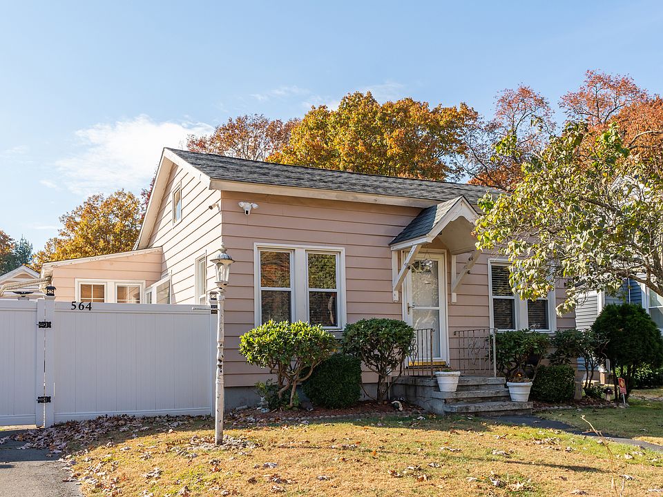 Welcome to 564 Laurel Street, a charming bungalow nestled in the heart of East Haven, CT. This tastefully decorated home offers a cozy and inviting atmosphere with over 1000 square feet of living space. Featuring two bedrooms and one bathroom, it provides a perfect retreat for comfortable living. Step inside to discover a welcoming living area boasting hardwood floors that seamlessly flows into a well-appointed kitchen, fully applianced - with expansive cabinetry and counter space for prepping and cooking. The full basement offers ample storage space and laundry. Outside, the .23 acre lot is a highlight, featuring a fenced yard that provides privacy and a secure space for relaxation. Enjoy leisurely afternoons on the porch or entertain in the yard, complete with an above-ground pool for those sunny days. The property also includes a detached garage and driveway for convenient parking. In addition this spacious home boasts a walk up attic for extra storage or possible expansion. Don't miss the opportunity to make it your own! New electrical panel, hot water heater 3 years old, roof 9 years old, furnace older but functioning