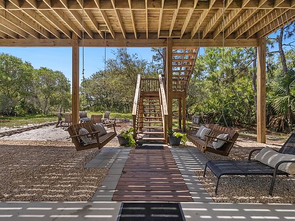 Renovated St George Island home nestled quietly on a high, dry lot among mature pines, live oaks and palm trees. Turn-key designed for easy living and fun at the coast with easy access to miles of acclaimed beach and coastal bike paths! Tasteful new furnishings and decor throughout, freshly painted interior and exteriors, and spacious new driveway. Featuring hours of laughter and relaxation at the spacious outdoor kitchen/entertainment area with cooking station, refrigerator, comfortable seating arrangements, and fire pit. The peaceful central living/dining area suffuses with natural light and opens to expansive front and back decks. Enjoy the glow of sunset and your choice of lounging in sunshine or shade throughout the day. Modern efficient kitchen with generous cabinetry, butcher block prep stand, granite counter tops, stone backsplash and stainless appliances. 3 BR, 2 BA split arrangement offers primary suite privacy. Outdoor shower, enclosed storage space and fenced pet yard. Oversized covered and open vehicle and boat parking. Low maintenance construction with concrete pilings, standing seam metal roof and high quality vinyl siding. All just a short golf-cart ride to local restaurants, shopping and music venues. New to rental program 8-1. Turn the key, unpack your bags, and begin living your St George Island Dream!