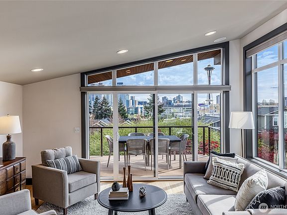 Soak up iconic Space Needle views and sleek modern style in this Queen Anne stunner. Vaulted ceilings and walls of windows flood the top floor with natural light, while a spacious deck with built-in gas grill sets the scene for sunset dinners, sparkling city lights, and NYE fireworks. The open kitchen features gas cooking, island seating, and a dumbwaiter to deliver groceries from your private garage. The primary suite also features epic city views and a spa-like 5 piece bath complete with heated floors. Downstairs, a built-in desk + Murphy bed = perfect 2nd bedroom or WFH flex space. On a quiet street, with a Walk Score of 92 you are close to everything— QFC, amazing food choices, Amazon, Meta, Google, Kraken games, concerts, & cocktails.