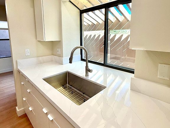 Private courtyardNeutral paintWhite cabinetsNew plank flooring
