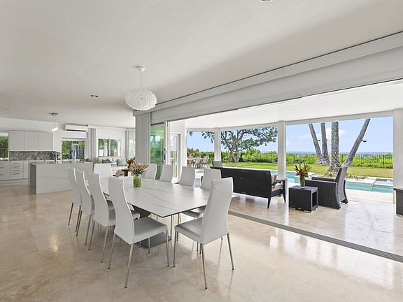From the moment you arrive, Paradise Beach Estate sets an elegant tone. A private, gated drive leads through manicured tropical landscaping and fragrant plumeria trees into a grand foyer with soaring ceilings, sunlit marble floors, and an abundance of natural light. Floor-to-ceiling glass walls vanish to reveal the estate's crown jewel: a sprawling pool terrace and beachfront lawn that seemingly melt into the horizon.