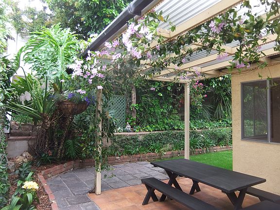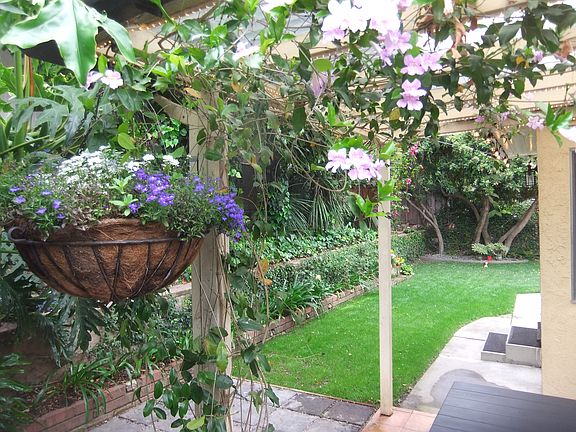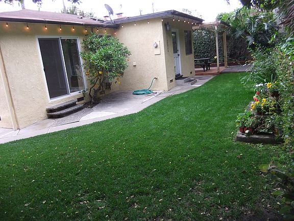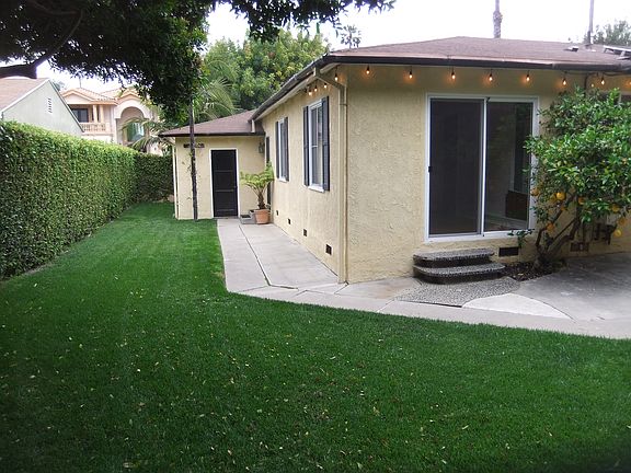3 blocks west of the 405 Freeway on and off ramps yet isolated from the sound because of the slope of the land. The street is only one block long so there is very little traffic. The living room & dining room ceilings are surrounded with a wide crown molding and the double paned windows and sliding glass door are new with screens. The wood burning fireplace has a large sandstone hearth with large wooden mantle. The touch screen gas heater thermostat can be programmed to turn on & off automatically at different times on different days of the week. The bathroom has a ceiling heat lamp & its own separate programmable thermostat for the under tile floor warmer. The bathroom has a built-in floor to ceiling storage cabinet, drawers under the sink & storage behind the 4 foot stainless steel double mirrored medicine cabinet. The tiles around the bath tub go to the ceiling. The bathroom radio / CD player has a remote control, an iPod cable, and an attic mounted high gain antenna that allows it to receive many stations. Many of the interior lights are dimmer controlled. The kitchen has a built-in flat screen TV with a high gain attic antenna. Under-cabinet lights illuminate the granite kitchen counter top and sink. The kitchen sink has a soap dispenser. The five-stage reverse osmosis water filter has its own separate sink faucet and supplies water to the ice maker in the stainless steel refrigerator. The 36" stainless steel, 5 burner stove top with electric ignition is like new. The illuminated stove hood has a fan that exhausts air to the roof-top. There are two 27"self-cleaning, stainless steel, convection ovens. Under the kitchen counter, there is a swing-up shelf & outlet where your mixer can be hidden yet, plugged in and ready to use. The stainless steel dishwasher is new. The master bedroom has an 8 ft wide closet and a 4ft X 8ft framed mirror. The hardwood floors in the bedrooms, hall and office have just been recently refinished. The 5ft X 15ft office has a 9ft wide x 7ft. tall book case. The windows have 2" blinds. The closets have electrical outlets. All electrical outlets are grounded for three prong plugs. There is an automatic security light on the front of the garage, the front porch & next to each of the three back doors. The fenced back yard has a gate with dead bolt lock. The recently tiled patio has a tinted covering and a dimmer controlled rope light containing 1200 LED lights. The grass and plants in the planters and hanging baskets are watered by a timer. A backyard tree produces delicious lemons. The rain gutters divert the rain water through underground pipes to the street. Updated no-lead copper plumbing with a high efficiency hot water heater can supply plenty of water flow through insulated pipes. The two car finished garage has a remote opener. Price includes a gardener. No smoking please. For more information leave a phone message.