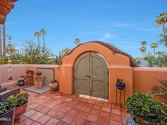 Experience timeless Arizona living in this beautifully crafted single-level custom home, perfectly situated within an exclusive gated community just one mile from Scottsdale Fashion Square. Featuring 4 spacious bedrooms and 3 full baths, this residence blends authentic Southwest-territorial charm with refined modern craftsmanship. Step inside to find a stunning custom-designed kitchen, complete with handcrafted cabinetry by Amish artisans, premium finishes, hand-punched copper sinks,  and an open layout ideal for both everyday living and entertaining. The home's warm character shines through with soaring ceilings adorned with natural tongue-and-groove wood, Saltillo tile flooring ,and an inviting, free-flowing floor plan filled with natural light. The outdoor spaces are equally impressive from the welcoming front courtyard to the resort-style backyard featuring a sparkling pool, fire and water features, and an extended covered patio with a built-in BBQ all thoughtfully designed for the ultimate Arizona outdoor lifestyle. Located in a private gated community offering tennis courts, this home is within walking or biking distance to world-class dining, golf, and entertainment. Enjoy the perfect balance of privacy, comfort, and convenience in one of Scottsdale's most desirable locations.