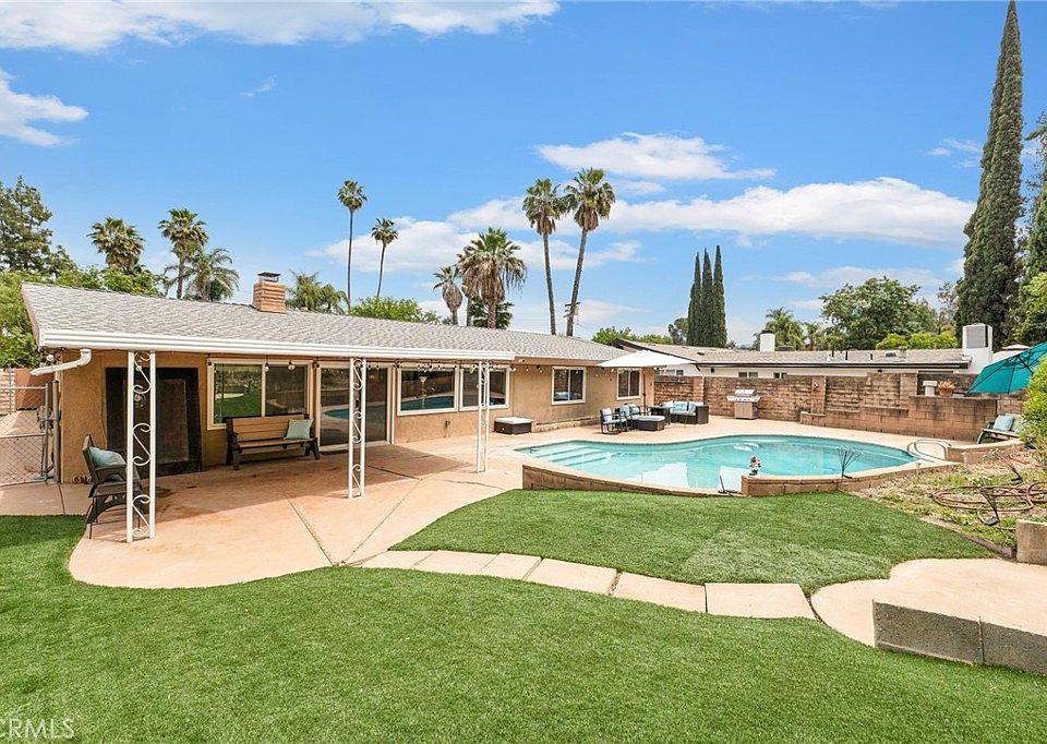 Welcome to an enchanting haven in Carlton Terrace, Woodland Hills nestled on an expansive pool lot! Its prime location, adjacent to Warner Center, offers effortless access to the 101 freeway, the Westside, and beaches. Step inside and be greeted by a grand, open living space where a beautiful fireplace vaulted ceilings and a spacious dining area invites joyful gatherings. The charming country kitchen, with its cabinetry and ample counter space, is a culinary delight, complete with a double oven, stove, dishwasher, and double sink. This abode boasts three delightful bedrooms and two baths. The primary suite features laminate floors, lofty ceilings, and a generous walk-in closet. Indulge in the ensuite master bath, featuring a tub/shower and dual vanity, perfect for unwinding after a long day. Two additional bedrooms share a well-appointed bathroom with a shower/tub and vanity. Step outside to the tranquil backyard, a true oasis of serenity, with a stunning pool and breathtaking views from the top of the property. The spacious backyard offers endless possibilities for magical moments. Use your imagination for the possible transformation of the two-car garage. Perfectly situated near the 101 Freeway, The Westfield Mall, The Village in Woodland Hills, and an array of entertainment, shopping, and dining options, this home is a gateway to a world of delight!