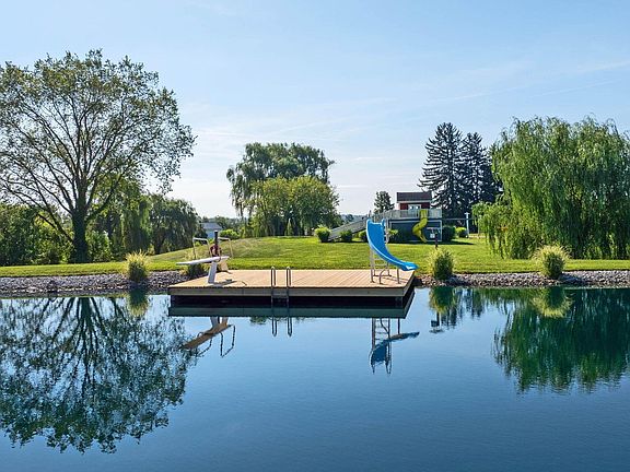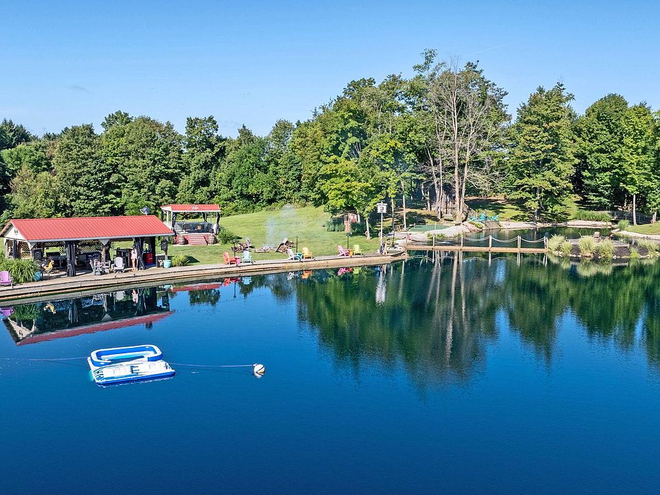 RESORT!!! CORPORATE RETREAT!?! WEDDINGS AND EVENTS VENUE!?! CHURCH CAMP!?! FAMILY RESORT by subdividing into a FAMILY COMPOUND?! FARM MARKET? Camper Storage Rental? or CAMPSITES?!? STUNNING BLUE LAKE w/ FISHING! Stocked Lake w/ Boardwalk and Anrondak Chairs & pole holders & Fish Cleaning Cabin w Sink ; SWIMMING: Diving Board & Slide; Beautiful Sandy Beach & Floating Island with In-water seats; CANOEING! KAYAKING! GOLFING!: Driving Tee w/ Targets across the Lake w/ Putting Green; RELAXING! Live MUSIC Stage & Movie Projection Curtains! & SPORTS BAR (Shelter with TV & Sink & Grill (options); Floating wood Bridge to Peaceful Seating on Island!; Cabin in the Woods for HOT SAUNA! with TeePee Fire Pit: Log Cabin nearby with it's Own Fire Pit and 3 more Pits! Fire Plug Fountain! Beach Sand Volleyball! Basketball Court! 2 Huge Metal Buildings with Indoor Basketball and Baseball Pitching and Hitting Options! Same Building with an Awesome Workshop! Endless potential on nearly 22 acres just 45 minutes from downtown Columbus, plus quick access to I-71 to Polaris and the Future Johnstown Chip Plant (about 30 minutes each). The main home offers 4 bedrooms with cedar-lined closets, 3.5 baths (including one in the basement), two living areas, separate dining spaces, a mudroom, main-level laundry, and a full basement that includes a Huge Walk-In Vault Door. Spiral Staircase! MUST SEE!