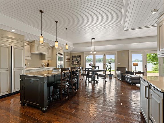 All OFFERS due no later than 7pm, Monday, May 26th. A spectacular river front home with some of the most breathtaking views in the area on Baugo Bay. This beautiful ranch home was completely renovated down to the studs in 2010/2011 and finished with the utmost quality construction and upgrades. A home that features both comfort and luxury with the engineered hardwood hand scraped flooring, open floor plan, gorgeous ceilings, custom kitchen, and gas fireplace with tile surround to name a few. The gourmet kitchen features granite and quartz, double ovens, cooktop with exhaust hood, ice maker, beverage refrigerator and high quality cabinetry. The adjacent sun room/office will be a favorite area of relaxation with the vaulted ceiling, sound system, recessed lighting and also a river view second to none. Both bedrooms are nice sized with hard wood flooring and share a gorgeous bathroom with two vanities, quartz countertops with backsplash, ceramic tiled flooring and a luxurious tiled shower. Outside you will find a deck that spans the width of the home that will be the perfect area for entertaining or unwinding after a long day. Nice size shed for outdoor equipment for maintaining this beautiful lot. The home has been meticulously cared-for; furnace- 2023, water heater- 2023, AC- 2018, New garage door- 2023, Garage epoxy flooring and painted- 2025, Deck freshly painted- 2025. Pier remains with home. Radon mitigation system, stone sea wall...Home has been pre-inspected and most repairs have been made. Inspection available upon request.