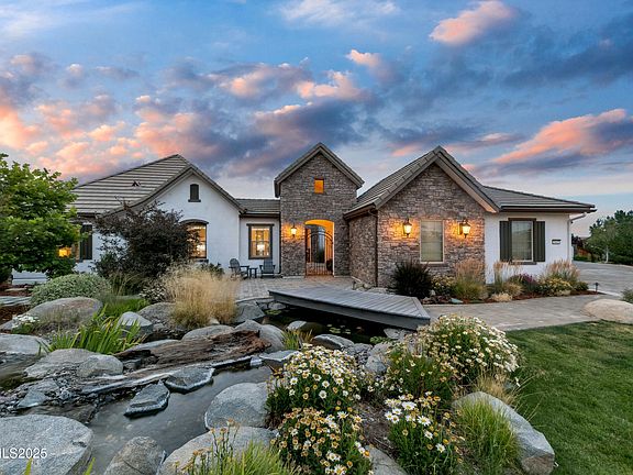 Luxury Meets Lifestyle in This Stunning Semi Custom-Built Entertainer's Dream - Welcome to this immaculate, single-story custom home built in 2015, offering 3,975 sq ft of luxury living on 1.086 beautifully landscaped acres. Featuring 4 spacious bedrooms, a dedicated office, and a 4-car garage, this property is a rare blend of elegance, functionality, and resort-style amenities. From the moment you enter the private courtyard—complete with a flowing stream, tranquil koi pond, and fireplace—you'll be captivated by the outdoor oasis that awaits. The backyard is an entertainer's paradise with a swim spa featuring an underwater treadmill and swim machine, separate spa, two electric cabana covers, two stone fire pits, a sunken outdoor kitchen with BBQ, sink, and island, and lush landscaping including a vineyard and dog run. Enjoy unobstructed views of Mt. Rose from the front and sparkling city lights from the back.