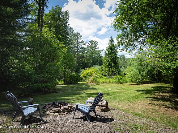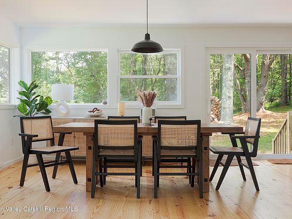 cozy wood-burning stove to tie it all together. Picture windows fill the home with sunshine and keep the surrounding forest always in sight. Harmoniously nestled into the trees, a sense of ease and tranquility define this special home. The spacious primary has extra high ceilings and a spa-like ensuite with a beautiful tiled shower. In addition to the home's three bedrooms, there is an extra den/office space that is a perfect flex use room. Glass sliders right off the kitchen lead out to the yard, ideal for grilling, dining al fresco and nights around the fire pit. Truly in nature's embrace—with seasonal mountain views—the Sundown, Willowemoc, and Slide Mountain Wild Forests and Wilderness areas are all within 30 minutes for amazing hiking, swimming, fishing, and just scenic drives. The popular Red Hill Fire Tower trail is just 2 mins away. This special retreat is only 40 mins to Belleayre for skiing, and just over 100 miles to the GWB in NYC!