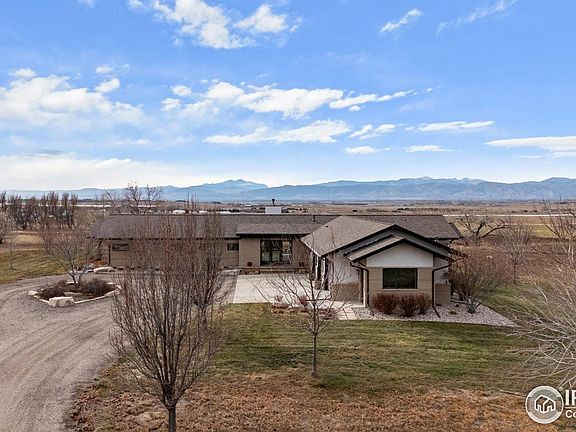 Experience exceptional Colorado living in this stunning custom ranch home set on 5 private acres with endless Front Range views. This 4-bedroom, 4-bath home offers 3,817 finished square feet and an open, contemporary layout designed for comfort and connection.The brick and stucco exterior hints at the quality inside. An inviting great room with gas fireplace flows easily to the dining room and gourmet kitchen. Natural white oak hardwood flooring spans the main level. The kitchen features a large island with seating, crushed-quartz countertops with space for a coffee bar, a Jenn-Air commercial-grade 6-burner gas range with stainless hood, Jenn-Air double ovens, Sharp drawer microwave, French door refrigerator, built-in beverage fridge, and a composition farm sink. A spacious walk-in pantry with functional shelving and baskets adds convenience. The main-floor laundry offers generous cabinetry and direct garage access.The primary ensuite showcases beautiful mountain views through perfectly placed windows. The 5-piece bath includes double quartz vanities, a soaking tub, and a large walk-in shower. Step directly from the suite to the private hot tub. A large walk-in closet connects seamlessly to both bedroom and bath. A secondary main-level ensuite bedroom sits on the opposite side of the home for added privacy.The daylight basement extends the living space with a large family room with gas fireplace, an additional ensuite guest bedroom, and a fourth bedroom with double walk-in closets. The oversized 1,172-sq-ft three-car garage provides ample room for vehicles, tools, and recreation gear.Outdoor living shines on the covered patio off the dining room, where you can enjoy dining, relaxation, and wide-open views. With 5 acres offering space and serenity just minutes from Fort Collins, this exceptional custom ranch home delivers luxury, privacy, and the true Colorado lifestyle.