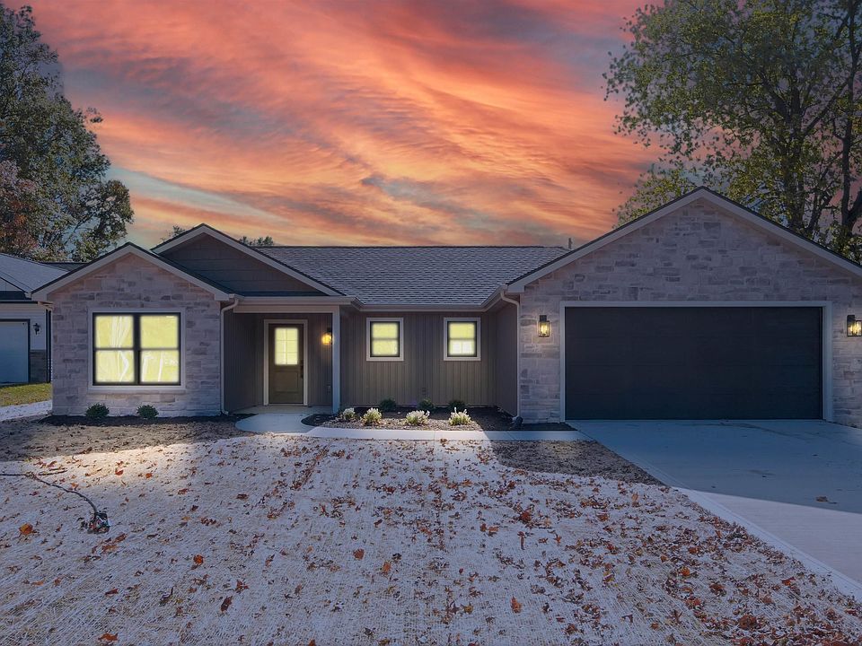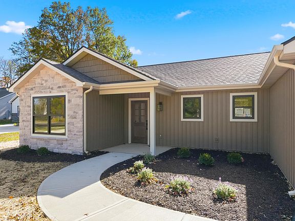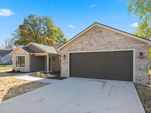 Welcome to this stunning brand-new custom-built home by Network Construction, designed with exceptional craftsmanship and high-end finishes that truly set it apart. The exterior features a beautiful stack-stone front with vinyl board-and-batten highlights and a vinyl shaker peak, paired with sleek black Andersen windows that add a modern edge. Step out back to enjoy a custom cut and stamped concrete patio, perfect for relaxing or entertaining, with landscaping already started, including grading and seeding. Inside, the open floor plan creates a bright, inviting atmosphere with vaulted ceilings and the perfect balance of light tones and bold dark accents. The home features three spacious bedrooms and two full baths, all finished with luxury vinyl plank flooring throughout. The custom kitchen is a showstopper, complete with handcrafted cabinetry, an oversized island with a custom-built base, tile backsplash, hard-surface countertops, a statement range hood, and stainless steel appliances. Elegant gold fixtures paired with black hardware tie the design together beautifully. The split-bedroom layout provides privacy, with the primary suite offering a large walk-in closet and a spa-like bathroom featuring a fully tiled shower with glass doors. The laundry room includes custom built-ins, and the mudroom offers additional storage to keep everything organized. The oversized garage provides extra space for projects or storage and includes a custom-color epoxy flake floor with a floor drain, as well as pull-down attic stairs leading to a decked storage area above. Every inch of this home has been thoughtfully designed for comfort, style, and practicality—with no HOA restrictions. Schedule your showing today and experience the craftsmanship and quality that make this custom home one of a kind!