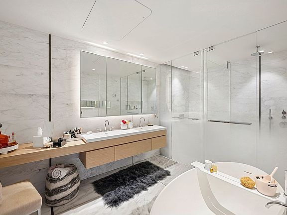 Residents enjoy 17,000 square feet of amenities including a 24-hour attended double-height lobby, a 55-foot heated indoor pool, sauna, steam room, full-service spa, fitness center with yoga studio, children’s playroom, and a resident lounge with soaring ceilings, a live green wall, and curated library. Automated parking is also available for purchase.