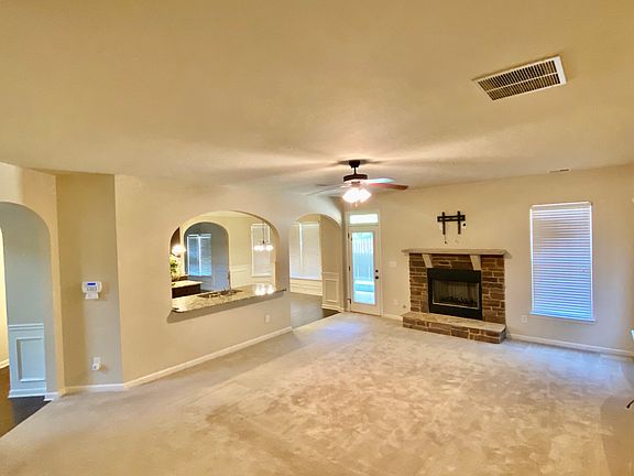 DRIVE HOME TO THIS SPACIOUS HOME WITH A FRONT PORCH. 2 STORY FOYER WITH HARDWOOD FLOORING. HUGE LIVING ROOM. DINING ROOM WITH COFFERED CEILINGS AND HARDWOOD FLOORING. CHEF'S KITCHEN WITH GRANITE COUNTERTOPS, ISLAND WITH HANGING PENDANT LIGHTS, 42 INCH CABINETS, GARBAGE DISPOSAL AND UPGRADED KITCHEN FAUCET. KITCHEN AREA FLOWS INTO MASSIVE FAMILY ROOM WITH STACK STONE FIREPLACE. TRIM GALORE. WROUGHT IRON RAILING. BLINDS THROUGHOUT. THE BIG WINDOW OVER THE FRONT DOOR HAS A WIRELESS REMOTE BLIND. OVERSIZED OWNER'S SUITE WITH VAULTED CEILINGS HUGE WALK-IN CLOSET. DOORS LEADING TO THE OWNER'S BATH SEPERATE VANITIES, GARDEN TUB, AND TILED SHOWER. ALL SECONDARY BEDROOMS ARE SPACIOUS WITH VAULTED CEILINGS AND CEILING FANS. HUGE FENCED BACKYARD WITH AN OVERSIZED COVERED PATIO.