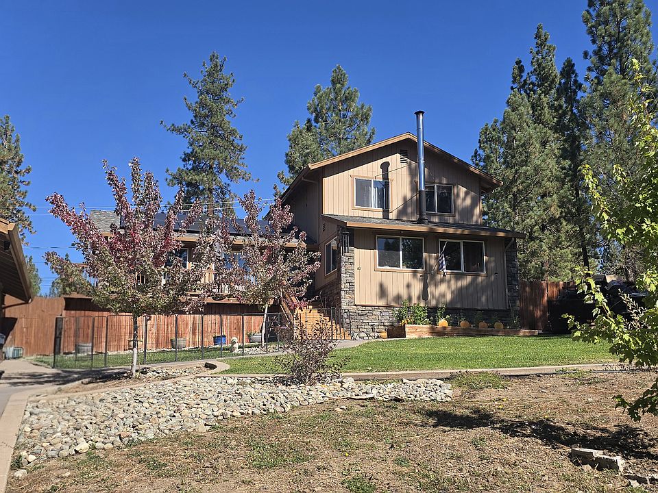 South facing 4 bedroom, 2.5 bathrooms. Unfurnished. All utilities included: electric, water, trash, wifi, 50% propane tank, cord of wood. $2700/mo. 6 month lease with option to renew. Detached 1 car garage with EV charger. Grass front lawn. Fenced in back yard. Conctete backyard patio. Wood stove in living room. Mini-split upstairs and down for heat/ac. Ceiling fans. Front wraparound deck. On demand propane hot water heater.