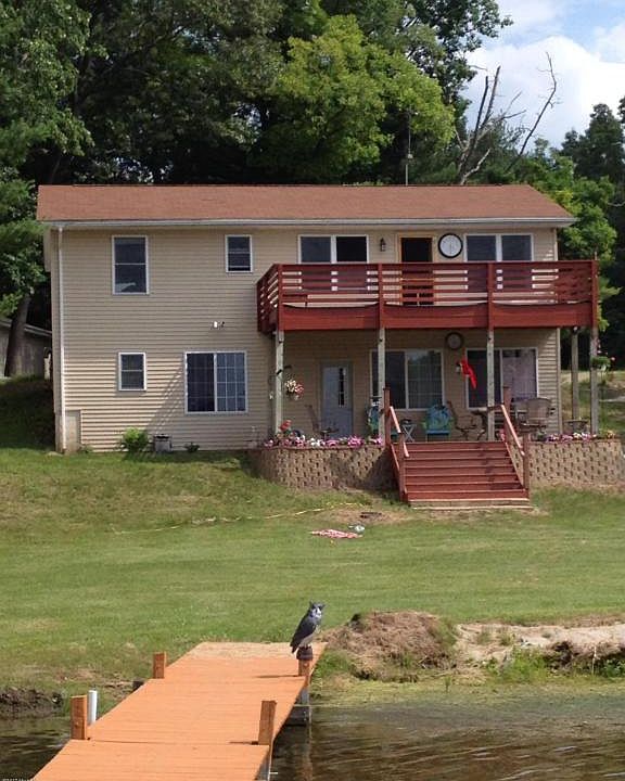 This is a fantastic lakeside home on a quiet all sports lake, with 65 feet of lake frontage. It has a permanent deep water dock with a 16 x 20 ft deck perfect for diving off or catching some rays. The house is 3 bedrooms and 3 bathrooms with an office. Enjoy the views from one of the two decks, the patio, or the great room. There is plenty of living space for your whole family with 1,000 sq ft upstairs and 800 finished sq ft down. This is a very low maintenance and economical home with natural gas.