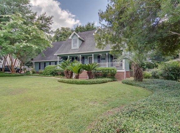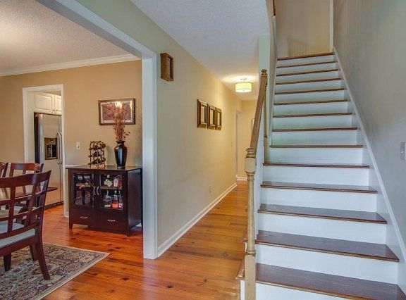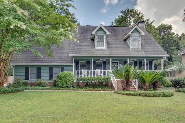 Beautiful heart pine floors in entry way; hall way, downstairs 1/2-bath, dining room, and kitchen. Large family room with wood burning fireplace, with outside access to back deck & private backyard. Separate Dining Room. Large Kitchen with granite & stainless steel appliances and lots of cabinet & counter top space; eat-in-kitchen overlooking backyard. Downstairs laundry off kitchen. Upstairs Master Bedroom. Master Bath has updated vanity with granite. Bedrooms 2 & 3 share full hall bath. Large 4th bedroom is over the garage & has a separate A/C unit. Double staircase with access from front entry way & from kitchen area. Enjoy the full front porch and 2-car side loading garage. This house has lots of under the eaves storage space in all bedrooms. Community has a boat dock.