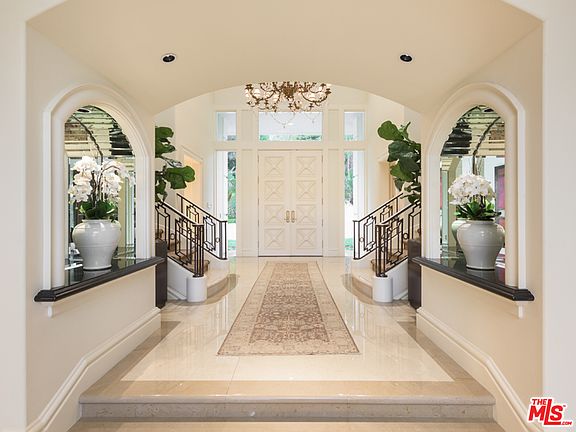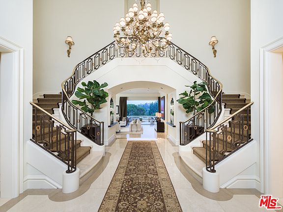 This modern Mediterranean sits on nearly an acre in the exclusive Platinum Triangle enclave known as Lower Perugia Way. One of only a dozen homes that border the Bel Air Country Club, this private compound is set behind gates and manicured palms that lead to a large motor court. A stately entry with a cascading double staircase opens to grand main level interiors such as a formal living room, family area with bar overlooking the famous golf course, formal dining room, wood paneled study, chef's kitchen with Viking appliances and breakfast room. Upstairs holds two generous guest suites, as well as a luxurious master with fireplace, private balcony overlooking the golf course, dual baths and walk-in closets. Pocket doors open to two levels of exceptional, sundrenched terraces with al fresco dining areas and a pool, all facing out to the world-class rolling green course. Features such as putting green and waterfalls complete this incredible opportunity to customize a sprawling estate.
