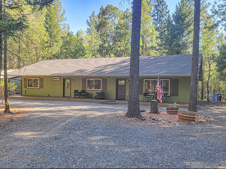Country peace and privacy. This 1980 square foot home is comfortable, open floor plan, lots of light and windows to bring the outside in. The great room includes living, dining and kitchen area. Vaulted ceilings and ceiling fans add ambiance. There is a wood stove in addition to a new heat pump unit for climate comfort. Solar system keeps electric cost at a minimum. Very wooded 5 acres with walking paths and several outbuildings. 20x40 shop includes partitioned and insulated hobby room. Large RV carport, another carport for parking, chicken coop, storage shed and 2 cargo containers for even more storage. This 3 bdrm 2 bath home is located at the end of a cul-de-sac with electric gate access and circular driveway. There is a covered deck the full length of the home and a hot tub out back. Kitchen has huge island/seating area with lots of storage. Includes all appliances you would expect (cooking = propane) and a trash compactor. There is a 50 amp RV service, water and dump.
