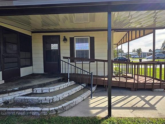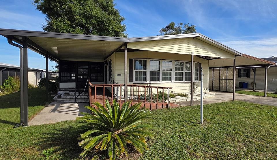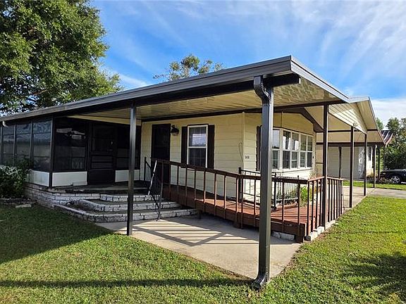 Spacious double wide in Betmar Acres. Great floor plan with 2 bedrooms & 2 bathrooms. Long carport with privacy lattice & sliding door for golf cart access. Attached workshop/utility room with work bench, storage shelving & double doors for secure golf cart parking. Covered front sidewalk with ramp, planter and side entry steps to raised Florida room & living room. Carport Entry foyer/laundry area with 2 built-in storage closets & cabinets. Centrally located kitchen features cooking island with vent hood, breakfast bar seating for four, built-in wall oven, dishwasher garbage disposal, closet pantry and lots of countertop prep space & ample cabinetry for storage. Formal dining area with built-in hutch and decorative lighting. Huge front living room with bow window, cathedral ceiling with fan, built-in bookshelves, coat closet and front entry door. Large den located off the kitchen features its own wet bar with built in wine rack & shelving, decorative lighting, linen closet & sliding glass door to the raised enclosed porch with wall ac & ceiling fan. Nice size second bedroom with ceiling fan, walk-in closet and on suite jack and jill style full bathroom with access to foyer/laundry area. Spacious primary bedroom suite with bow window, ceiling fan & en-suite bathroom with beadboard, double sinks, walk-in closet and walk-in shower with glass door. Exterior features include new membrane roof (9/2025), central HVAC (2018) updated double pane windows, Aluminum lap siding & covered rear storage area. Great location and just a short golf cart ride or walk to swimming pools, club houses, & park amenities. Un-furnished except for major appliances. This roomy home is waiting for you to make it your own. Located within Betmar Acres, one of central Florida's most highly sought after 55+ communities where you own your land. If you are looking for active and friendly community Betmar acres should be at the top of your list. With ample park amenities including bingo, dances, indoor shuffleboard, two swimming pools, two hot tubs, organized monthly activities, three nine-hole golf courses, miniature golf, park library, horseshoes, cornhole, pickleball, tennis, bocci ball, basketball court, gazebos, fenced pet play area & walking paths. This community has it all for your leisure. Call today to schedule your private tour of this lovely home and community.
