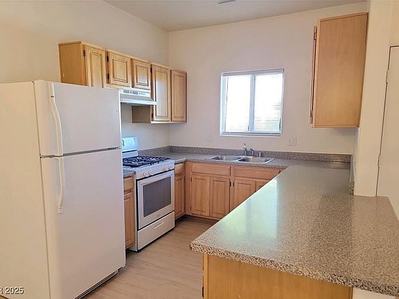 Discover this charming second-floor, gated-community gem located in Sunrise Manor. This cute two-bed, two-bath unit features sleek laminate floors throughout, no carpet in sight, offering a bright, clean, open-concept living and dining area. The galley kitchen comes complete with all appliances included, making cozy mornings and meal prep a pleasure. The spacious primary suite features a mirrored closet and a private bathroom with a separate garden tub and shower, perfect for relaxation. A second bedroom and full bath add versatility, whether you need a guest room, home office, or den. Sit back and relax under the covered awning on the balcony! Community amenities elevate your lifestyle: a resort-style pool, spa, and fitness center, all within the gated Terrasanta neighborhood. Situated minutes from shopping centers and Desert Rose Golf Course, this unit blends convenience and comfort. Do not miss this opportunity, call us today!