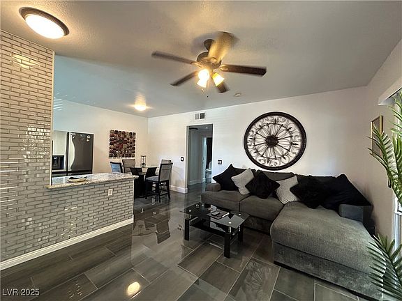 Stylish 2-Bed, 2-Bath Condo in a Gated Community Next to Desert Rose Golf Course. This beautifully upgraded condo features modern gray tile floors & baseboards that complement the gray shaker kitchen cabinetry, granite counters, backsplash, and comes complete w/ SS appliances. The breakfast bar overlooks a spacious family room with ample wall space for TV & furniture, enhanced by a striking entry accent wall. The guest bath is a showpiece with a dramatic black marble wall, new vanity, mirror, stylish lighting, and a glass door enclosure. The primary suite is generously sized with plush new carpet and a private bath featuring both a garden tub, separate shower, and linen closet. Additional highlights include updated light fixtures, window coverings throughout, and a full-size W/D in the hall closet. Community amenities include a pool, spa, fitness room, and community center, plus covered & guest parking. Water, sewer & trash are included in the HOA. Move-in Ready & Designed to Impress!